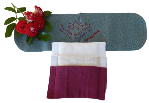Je nach Anwendung kann der wärmende Schafwollpolster (mit regionaler Bio Schafwolle) in Kombination mit einem Bio GOTS-zertifizierten Musselintuch kombiniert werden.